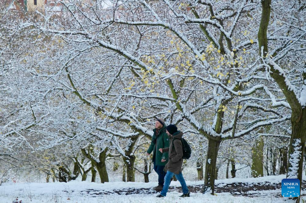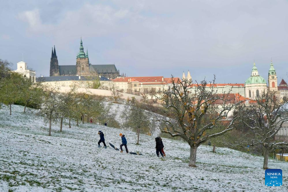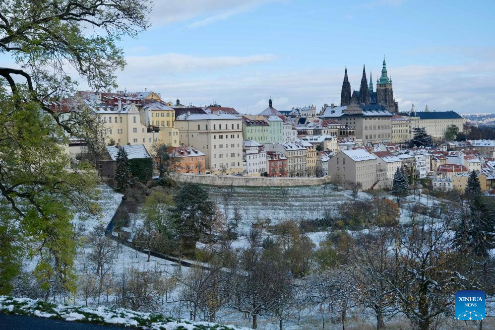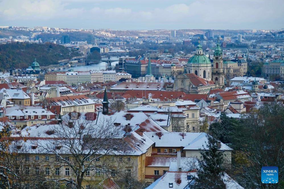 This photo taken on Nov. 26, 2023 shows a city view after snow in Prague, the Czech Republic. (Xinhua/Deng Yaomin)