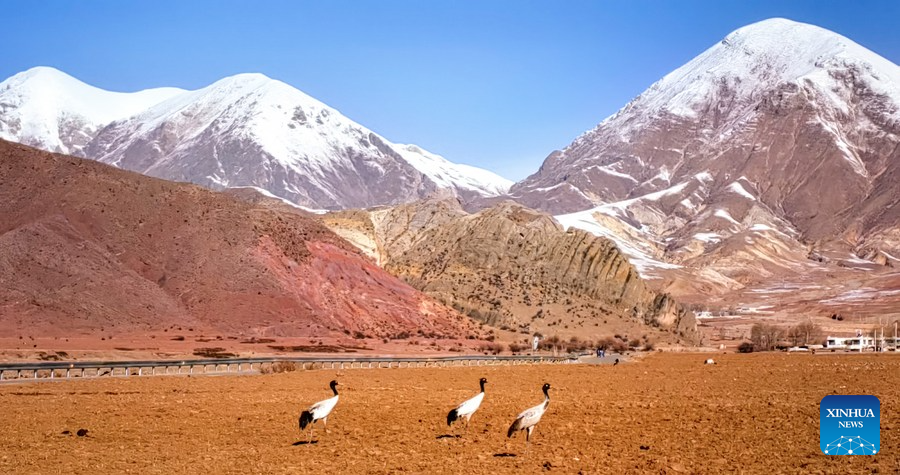 This photo taken on March 1, 2023 shows black-necked cranes in Lhunzhub County of Lhasa, southwest China's Xizang Autonomous Region. (Xinhua/Shen Hongbing)