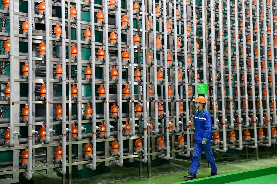 An employee checks a production line of a biotech company in Boxing County, east China's Shandong Province, Nov. 26, 2023. Boxing County has been strengthening industrial and supply chain construction to boost local economy in recent years. The county has cultivated and formed some leading industries including grain, oil and food processing, metal plates, commercial kitchenware and petrochemical industries. In the first three quarters of this year, the total industrial output value above the designated size of Boxing County reached 119.826 billion yuan (about 16.76 billion U.S. dollars). (Xinhua/Guo Xulei)