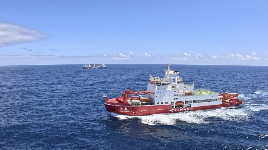 This aerial photo shows China's research icebreaker Xuelong 2 (front) and cargo vessel Tian Hui sailing in the belt of prevailing westerlies on Nov. 25, 2023. Currently on an Antarctic expedition, the icebreaker, otherwise known as Snow Dragon 2, is ploughing through the belt of prevailing westerlies, nicknamed the "rolling forties," with its companion cargo vessel Tian Hui. (Photo by Chen Dongbin/Xinhua)