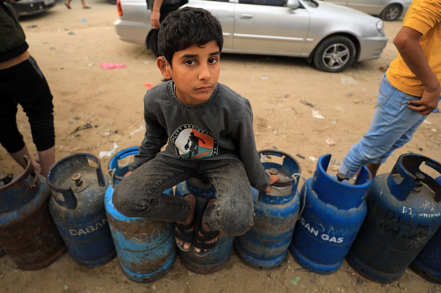 People wait to refill gas cylinders in the southern Gaza Strip city of Khan Younis, on Nov. 25, 2023. According to the UN Office for the Coordination of Humanitarian Affairs, on Friday, the first day of the Gaza truce, 200 trucks were dispatched to the Rafah crossing, and 137 trucks of goods were offloaded at the reception point of the UN Relief and Works Agency for Palestine Refugees in Gaza, marking the largest volume of aid to the enclave since the outbreak of the conflict. (Photo by Yasser Qudih/Xinhua)