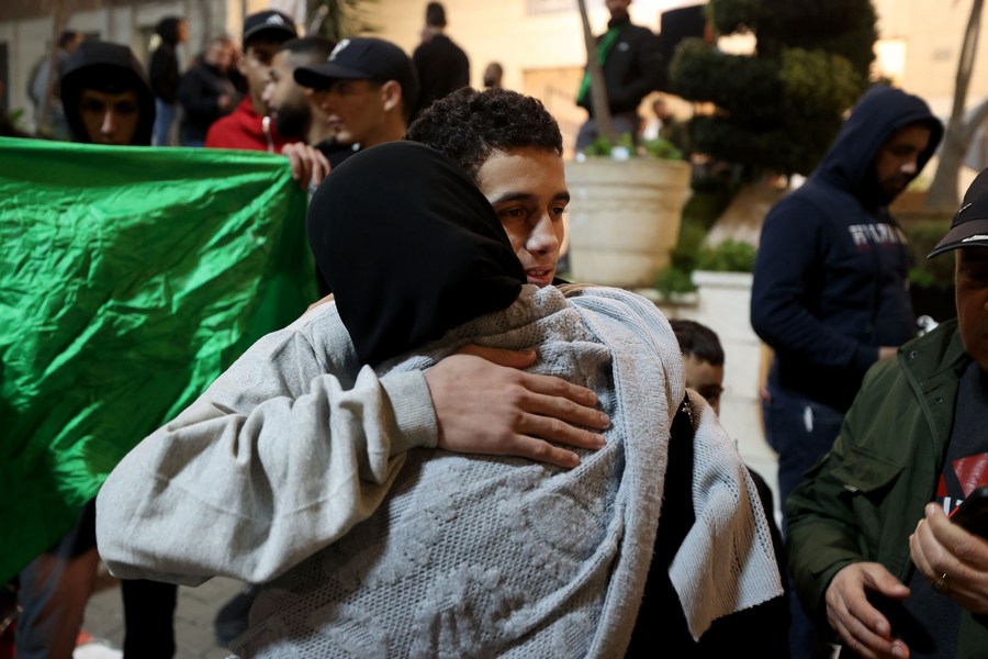 A released Palestinian prisoner reunites with family members in the West Bank city of Al-Bireh, Nov. 26, 2023. About three dozen Palestinian prisoners released by Israel arrived in the West Bank on Sunday, following Hamas' release of 17 hostages in the second round of swaps under a cease-fire deal. (Photo by Nidal Eshtayeh/Xinhua)