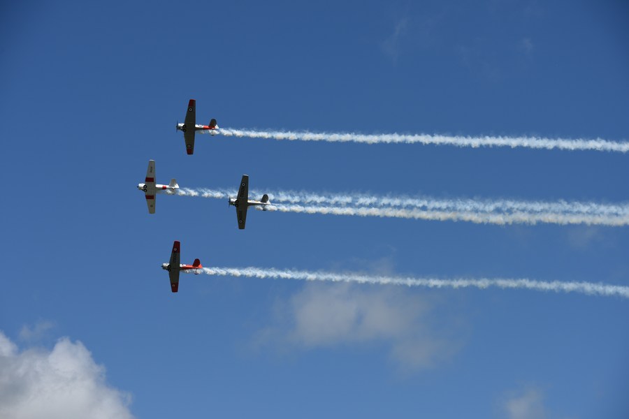 Airplanes perform during the Wings Over Wairarapa Air Festival at the Hood Aerodrome in Masterton, New Zealand, Nov. 26, 2023. Thousands of people gathered and crowded the side of the airstrip of Hood Aerodrome in Masterton, New Zealand on Sunday to watch the biennial Wings Over Wairarapa airshow. The Wings Over Wairarapa Air Festival this year features over 70 aircraft including vintage, military, and New Zealand Defence Force aircraft, jets, helicopters and aerobatic displays. (Xinhua/Lu Huaiqian)