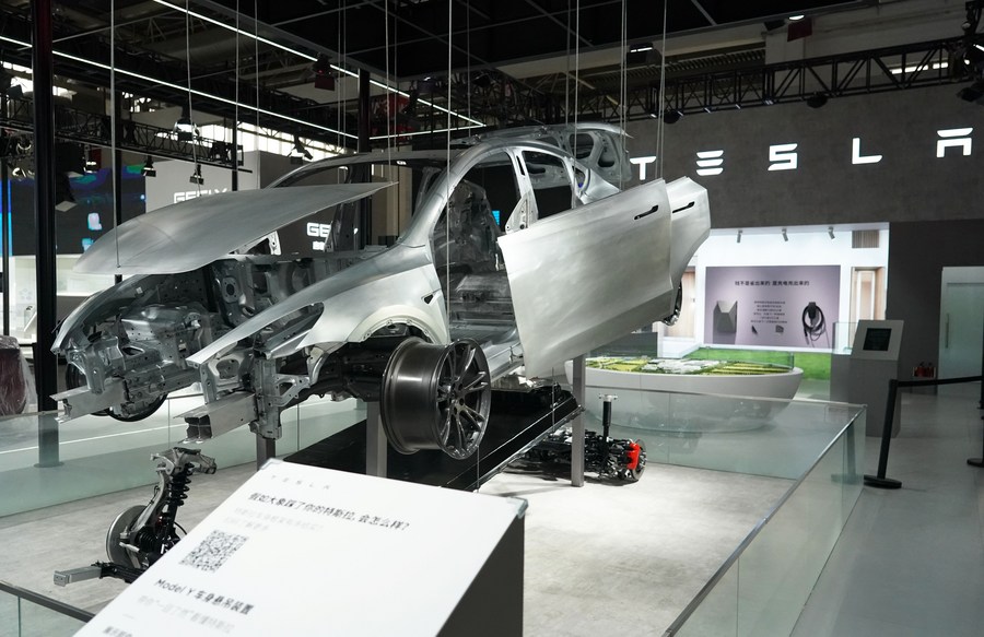 This photo taken on Nov. 26, 2023 shows the booth of Tesla at the venue of the China International Supply Chain Expo (CISCE) in Beijing, capital of China. The CISCE is set to be held in Beijing from Nov. 28 to Dec. 2, with the theme of "Connecting the World for a Shared Future." With an exhibition area of over 100,000 square meters, the expo will have areas dedicated to supply chains for the smart vehicle, green agriculture, clean energy, healthy living and digital technology. (Xinhua/Ren Chao)