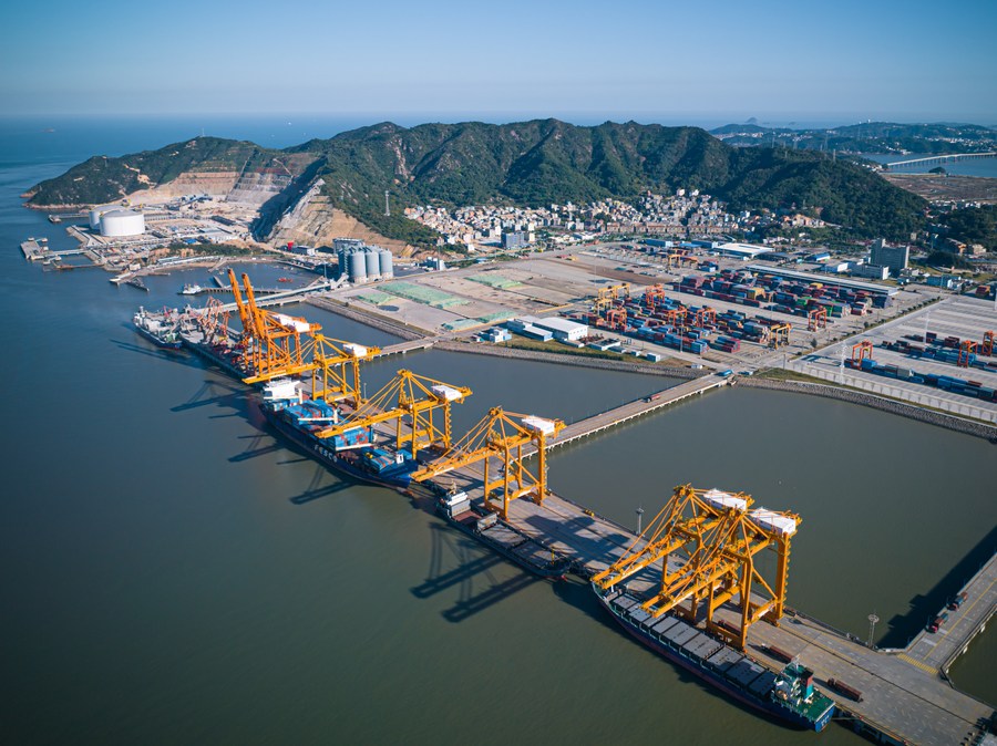 This aerial photo taken on Nov. 22, 2023 shows cargo ships docking at the Zhuangyuan'ao container terminal of Wenzhou Port in Wenzhou, east China's Zhejiang Province. Wenzhou Port is one of the main ports along the coast of Zhejiang Province. With routes covering many important international and domestic port cities, Wenzhou Port plays an important role in promoting economic and trade cooperation among the Belt and Road Initiative (BRI) participating countries of the surrounding areas. The shipping throughput of Wenzhou Port exceeded 72 million tonnes in the first ten months of 2023. (Xinhua/Jiang Han)