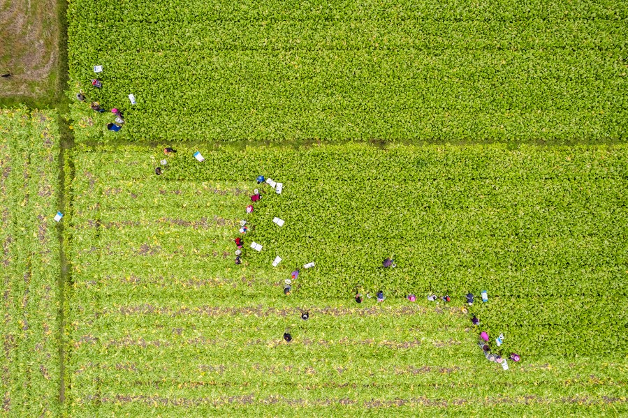 This aerial photo taken on Nov. 26, 2023 shows farmers harvesting mustard stems in Taibaizhou Village of Nanxian County, central China's Hunan Province. The total output value of about 20,000 mu (about 1,333.3 hectares) of mustard stems in Nanxian County is expected to reach 50 million yuan (about 6.9996 million U.S. dollars) this year. (Xinhua/Chen Sihan)