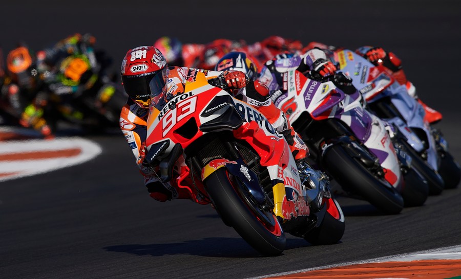 Riders compete during the Sprint race of the Valencia MotoGP at Ricardo Tormo Circuit, in Valencia, Spain, on Nov. 25, 2023. (Str/Xinhua)