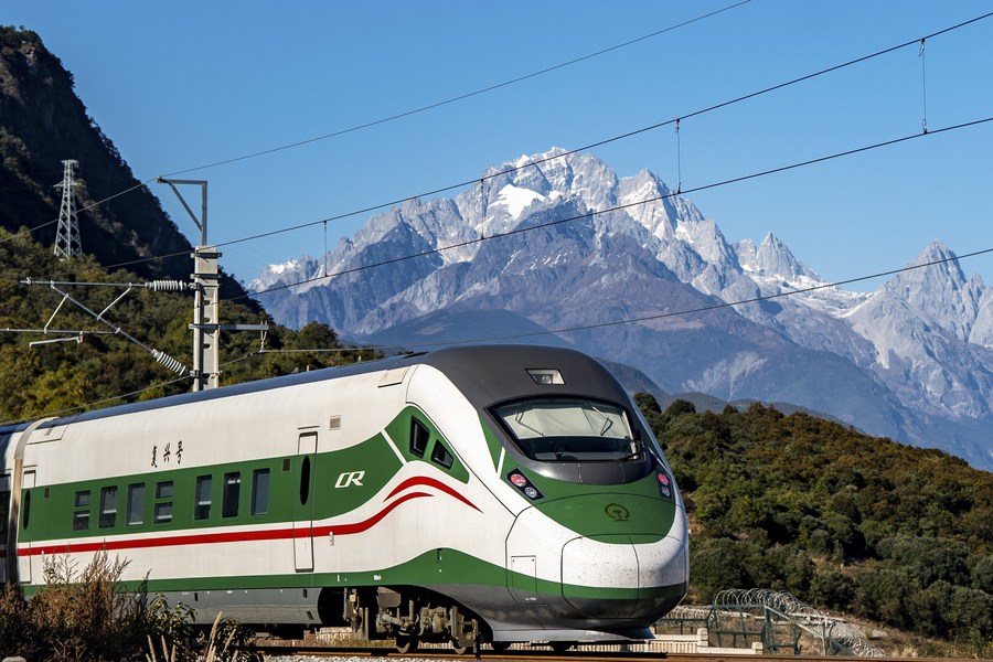 This photo taken on Nov. 26, 2023 shows a train running at the foot of the Yulong Snow Mountain in southwest China's Yunnan Province. A railway linking the cities of Lijiang and Shangri-la, two well-known tourist destinations in southwest China's Yunnan Province, opened to traffic on Sunday, according to local authorities. With the operation of this 139-km railway, the fastest trip between the two cities only takes 1 hour and 18 minutes. The railway also connects Shangri-la, in the Diqing Tibetan Autonomous Prefecture, to the provincial capital Kunming. (Xinhua/Hu Chao)