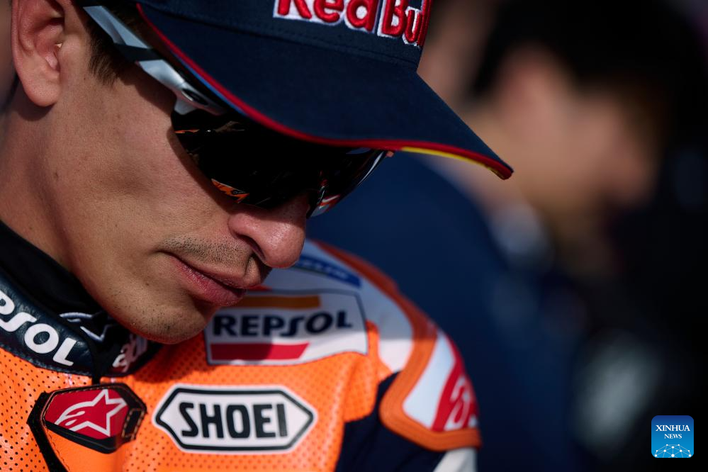Marc Marquez of Repsol Honda Team reacts after the race of the Valencia MotoGP at Ricardo Tormo circuit, Valencia, Spain, Nov. 26, 2023. (Str/Xinhua)