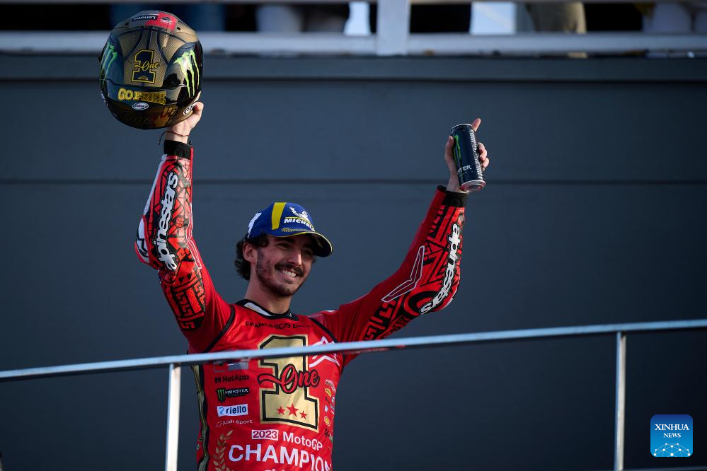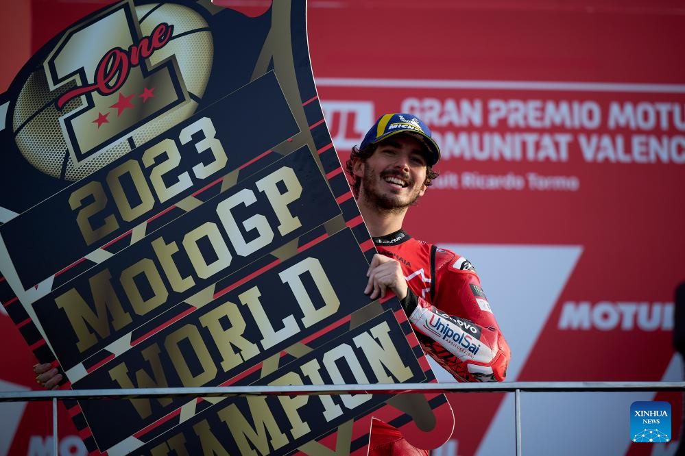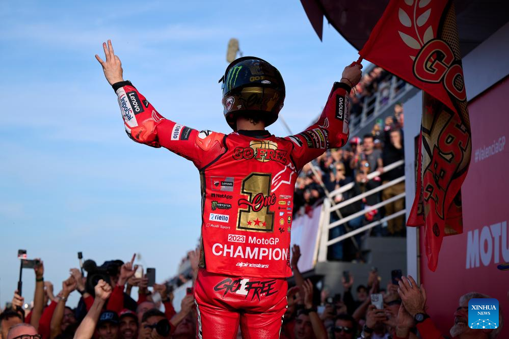 Francesco Bagnaia of Ducati Lenovo Team celebrates after the race of the Valencia MotoGP at Ricardo Tormo circuit, Valencia, Spain, Nov. 26, 2023. (Str/Xinhua)
