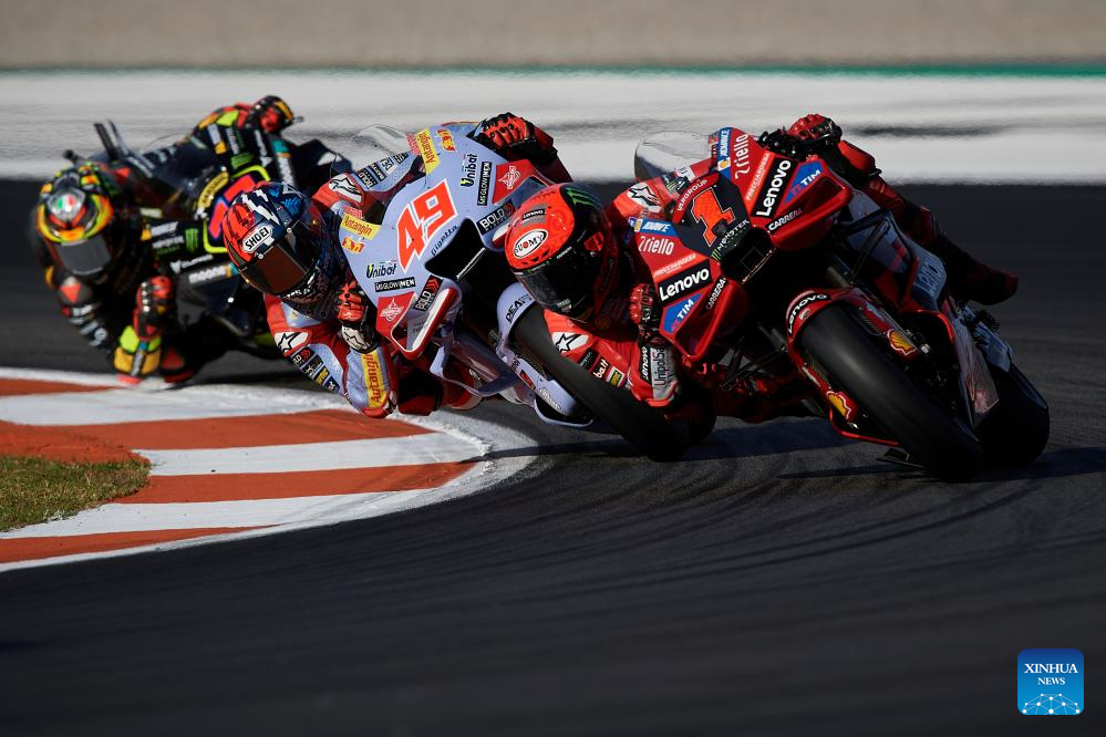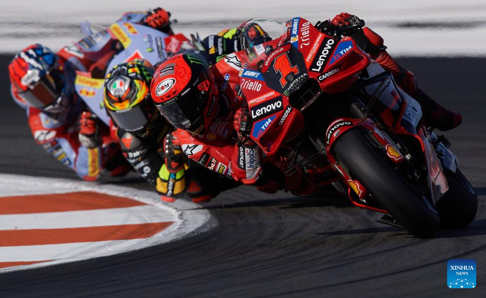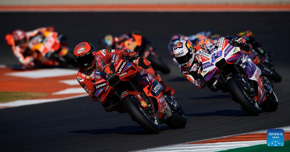 Francesco Bagnaia (front) of Ducati Lenovo Team competes during the race of the Valencia MotoGP at Ricardo Tormo circuit, Valencia, Spain, Nov. 26, 2023. (Str/Xinhua)