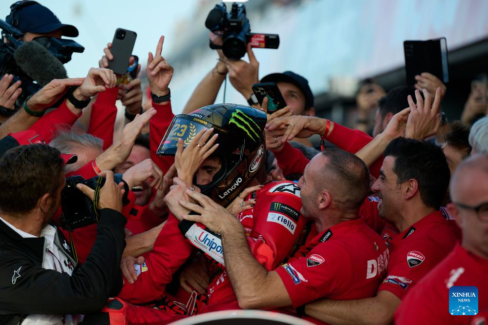 Francesco Bagnaia (C) of Ducati Lenovo Team celebrates after the race of the Valencia MotoGP at Ricardo Tormo circuit, Valencia, Spain, Nov. 26, 2023. (Str/Xinhua)