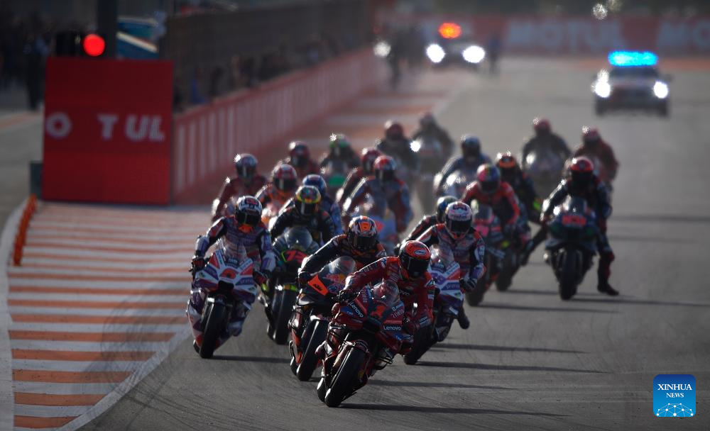 Riders compete during the race of the Valencia MotoGP at Ricardo Tormo circuit, Valencia, Spain, Nov. 26, 2023. (Str/Xinhua)