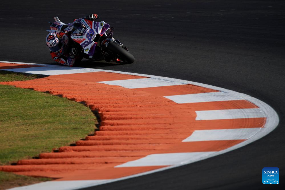 Jorge Martin of Prima Pramac Racing competes during the race of the Valencia MotoGP at Ricardo Tormo circuit, Valencia, Spain, Nov. 26, 2023. (Str/Xinhua)