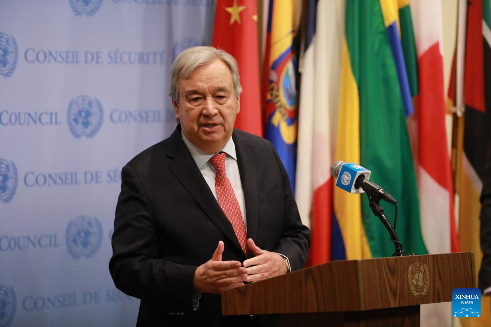 UN Secretary-General Antonio Guterres speaks to the press outside the Security Council Chamber at the UN headquarters in New York, on Nov. 27, 2023. Guterres emphasized on Monday that world leaders attending the COP28 climate conference this week need to interrupt the perilous progression of global warming before a "critical tipping point" is encountered. COP28, which refers to the 28th session of the Conference of the Parties to the United Nations Framework Convention on Climate Change, is scheduled to be held in Dubai, the United Arab Emirates, from Nov. 30 to Dec. 12. (Xinhua/Xie E)