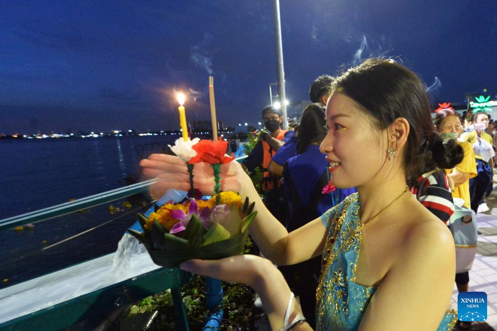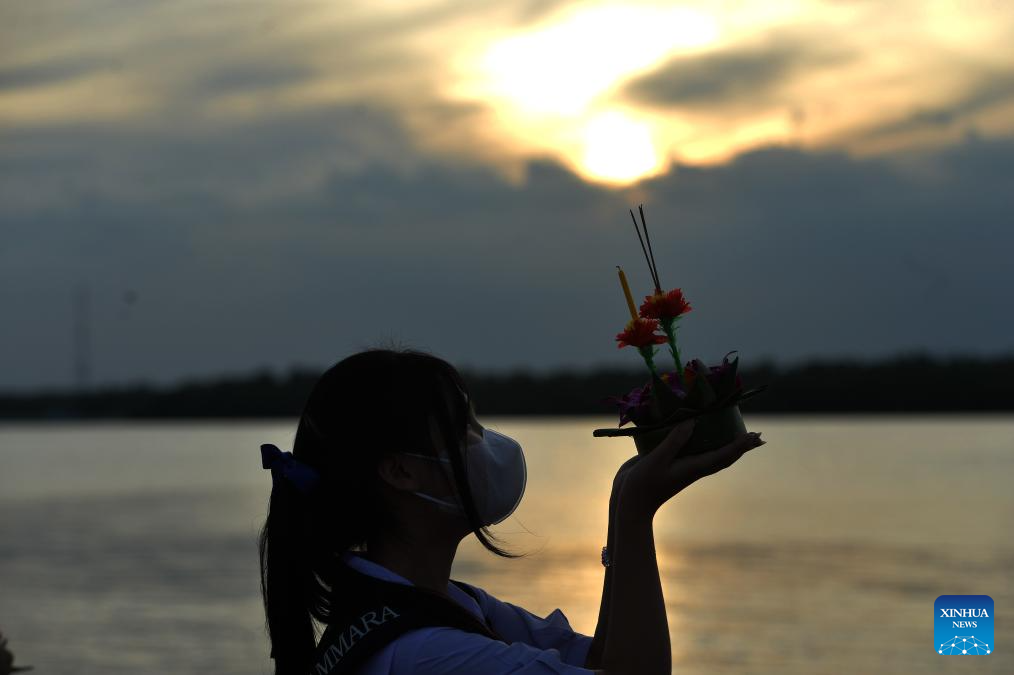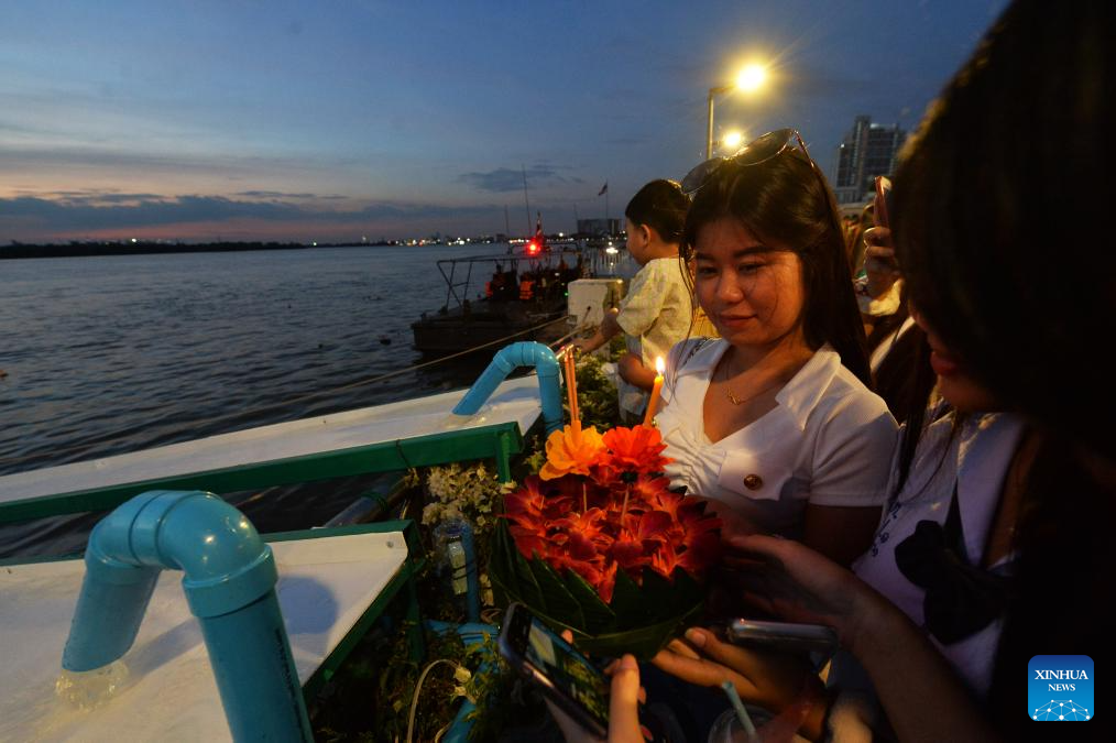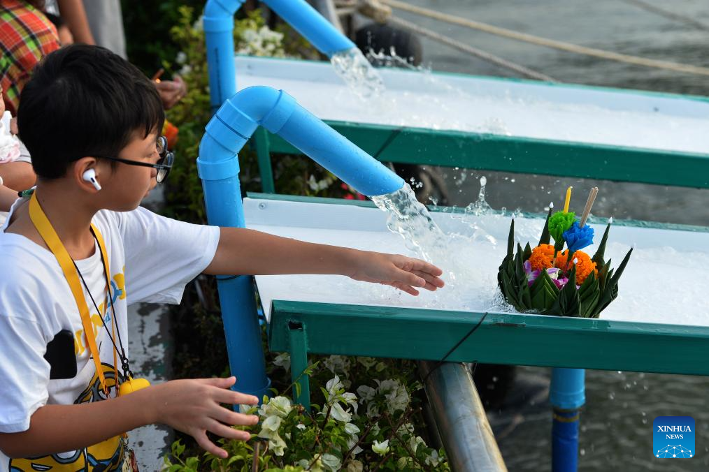 People release water lanterns during the Loy Krathong Festival in Bangkok, Thailand, Nov. 27, 2023. (Xinhua/Rachen Sageamsak)