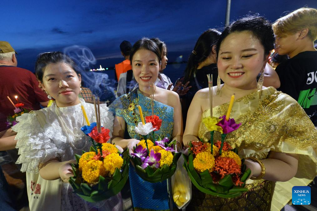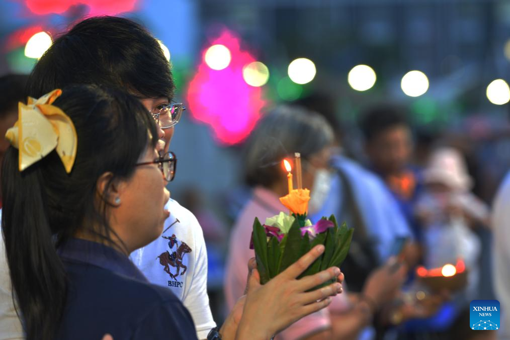People prepare to release water lanterns during the Loy Krathong Festival in Bangkok, Thailand, Nov. 27, 2023. (Xinhua/Rachen Sageamsak)