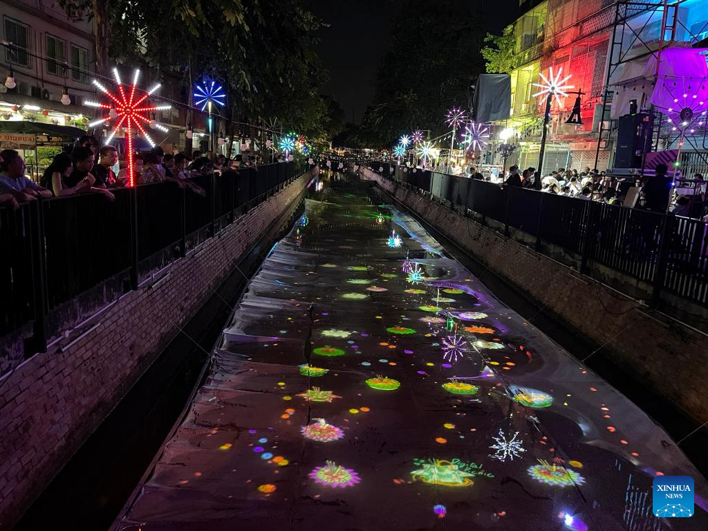 Digital water lanterns are seen at a canal during the Loy Krathong Festival in Bangkok, Thailand, Nov. 27, 2023. (Xinhua/Chen Jiabao)