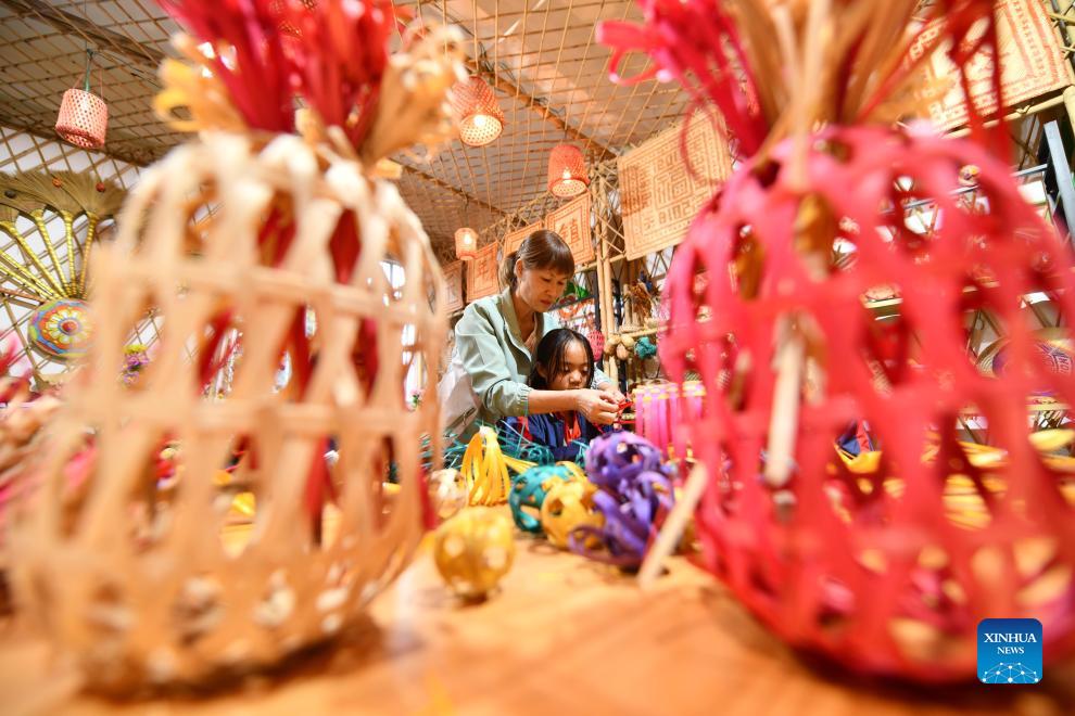 A student practices the bamboo weaving skill at Nandu primary school in Cenxi City, south China's Guangxi Zhuang Autonomous Region, Nov. 28, 2023. As a local intangible cultural heritage, the bamboo weaving skill was introduced to Nandu primary school in recent years, which enriched the extracurricular activities of the students. (Xinhua/Huang Xiaobang)