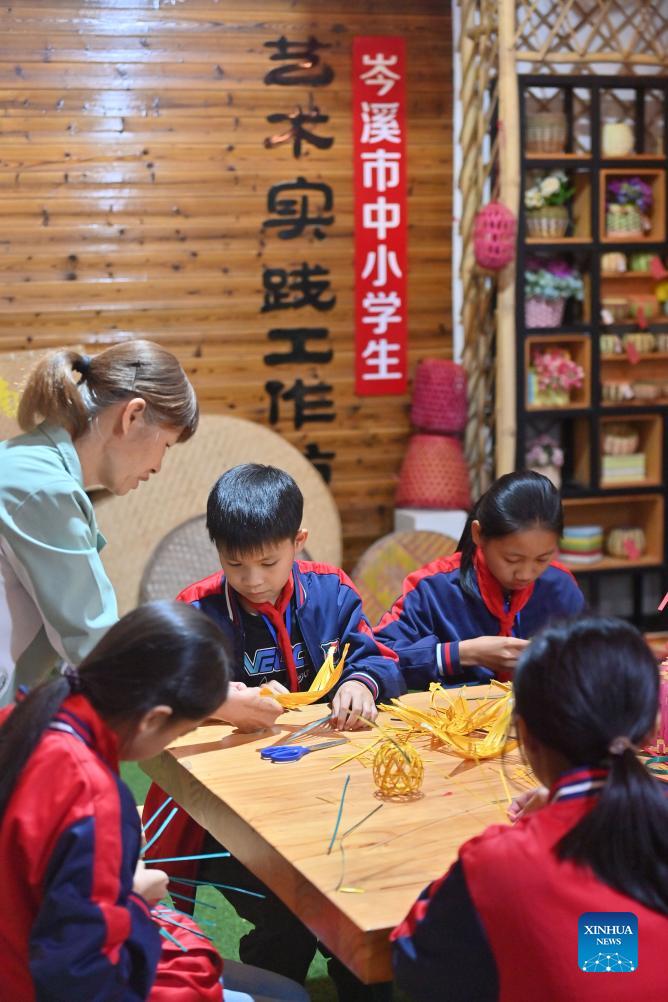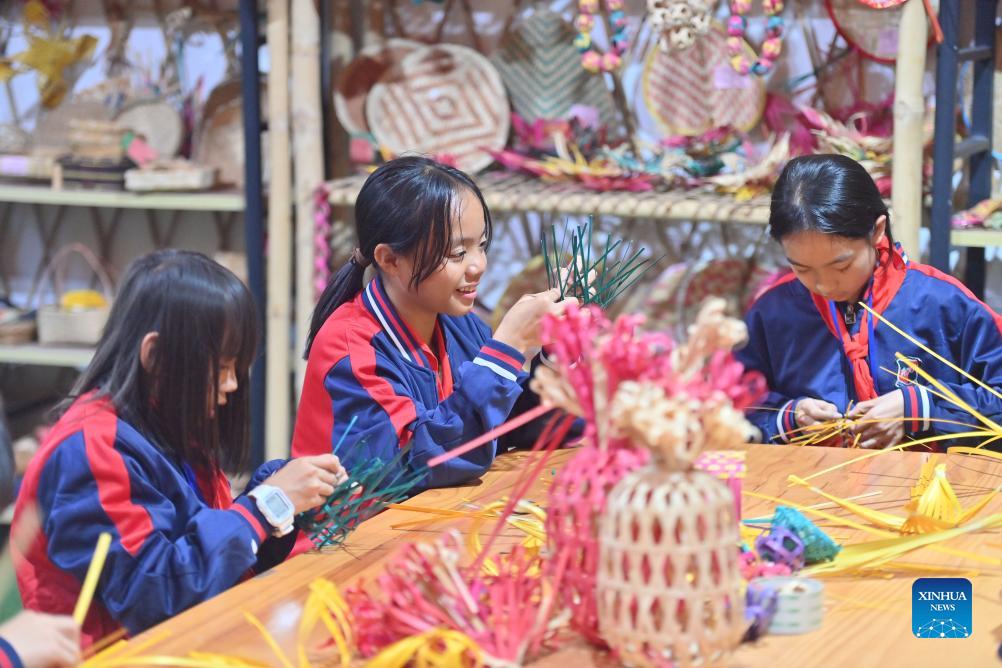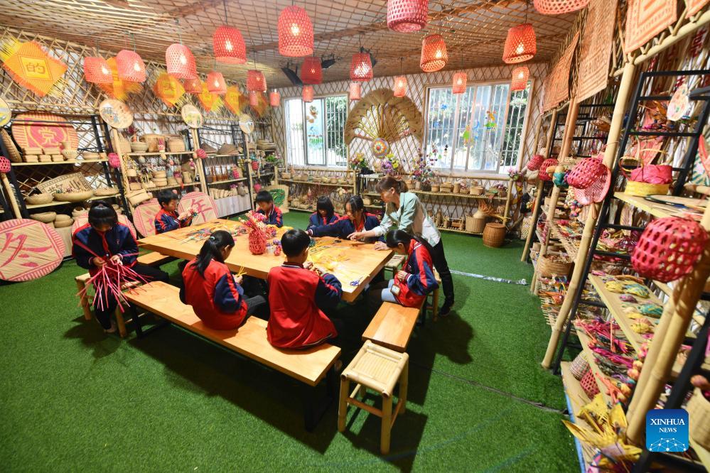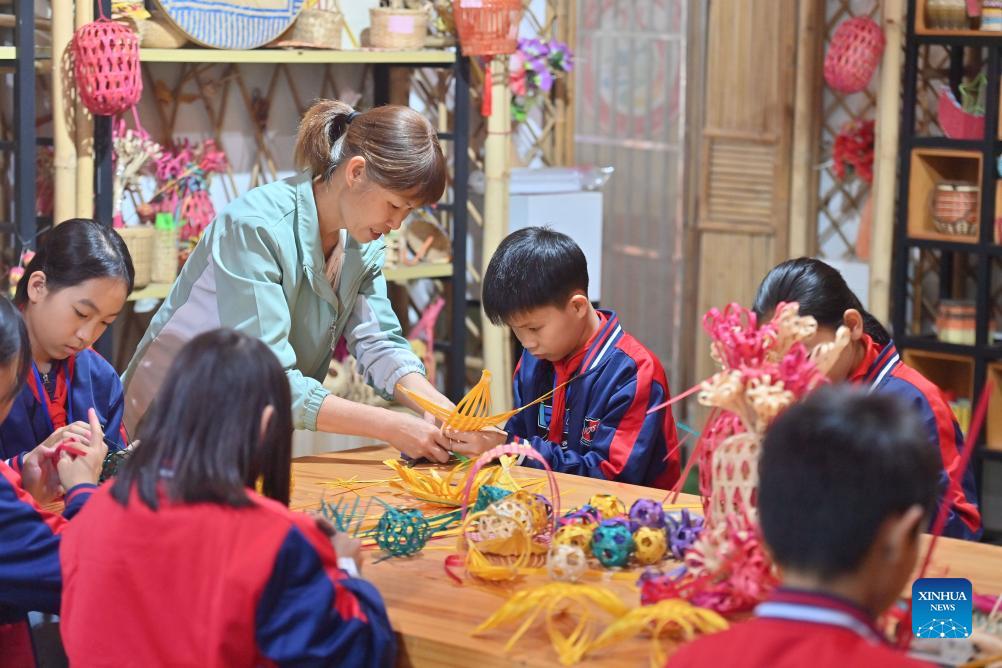 Students practice the bamboo weaving skill at Nandu primary school in Cenxi City, south China's Guangxi Zhuang Autonomous Region, Nov. 28, 2023. As a local intangible cultural heritage, the bamboo weaving skill was introduced to Nandu primary school in recent years, which enriched the extracurricular activities of the students. (Xinhua/Huang Xiaobang)