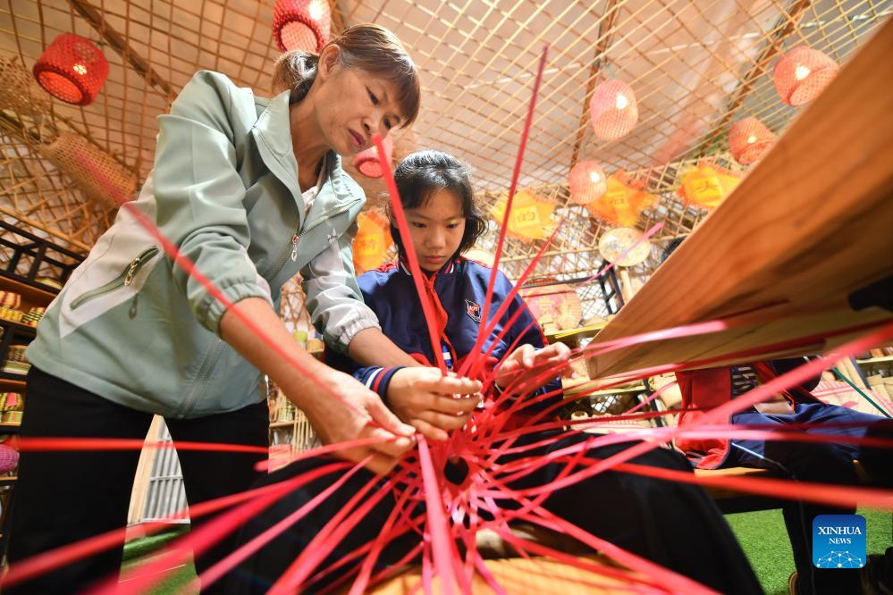 A student (R) learns the bamboo weaving skill from a teacher at Nandu primary school in Cenxi City, south China's Guangxi Zhuang Autonomous Region, Nov. 28, 2023. As a local intangible cultural heritage, the bamboo weaving skill was introduced to Nandu primary school in recent years, which enriched the extracurricular activities of the students. (Xinhua/Huang Xiaobang)