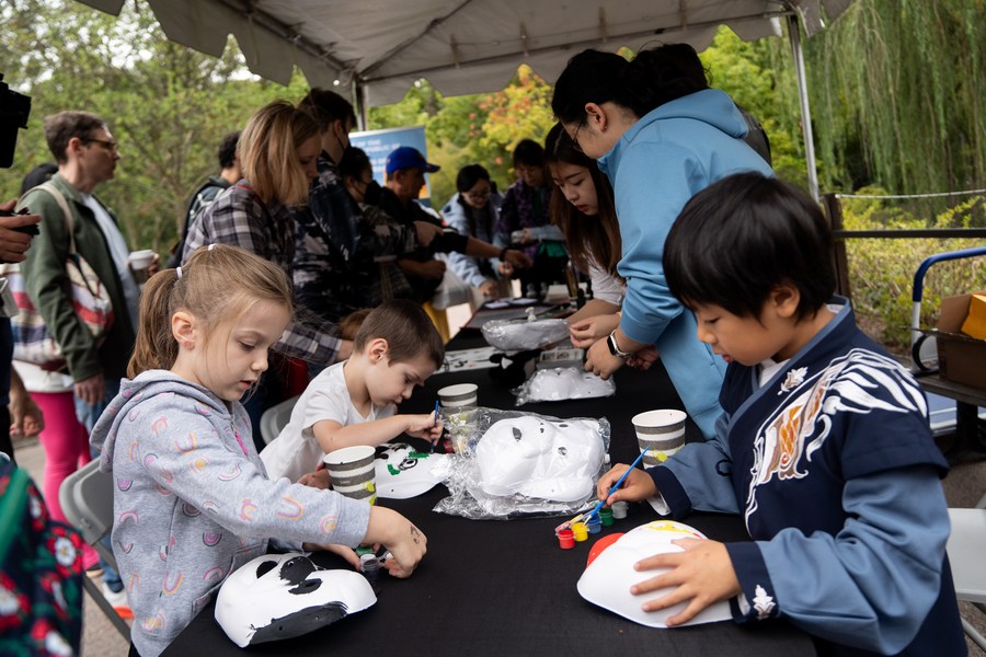 Children take part in a giant panda mask-making activity at the Smithsonian's National Zoo in Washington, D.C., the United States, Sept. 30, 2023. (Xinhua/Liu Jie)