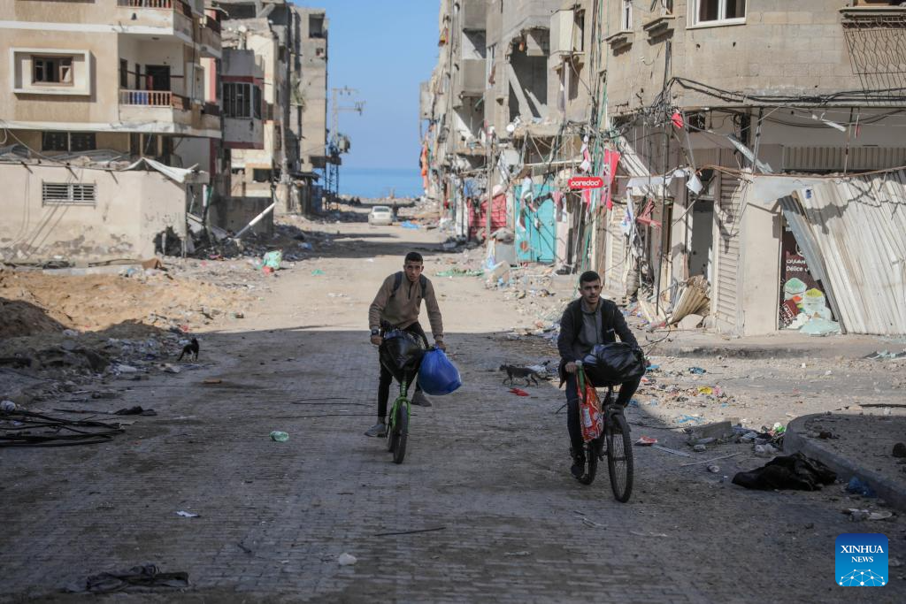 People ride bicycles in Gaza City, on Nov. 29, 2023. After weeks of Israeli strikes on Gaza in retaliation for an attack on Oct. 7 by Hamas against Israel, the two sides reached a four-day humanitarian truce last week, which was extended for another two days starting on Tuesday. The Palestinian death toll from the Israel-Hamas conflict has surpassed 15,000, according to Palestinian figures. Israel said that the Hamas attack killed about 1,200 people while more than 200 people were taken as hostages. (Photo by Mohammed Ali/Xinhua)