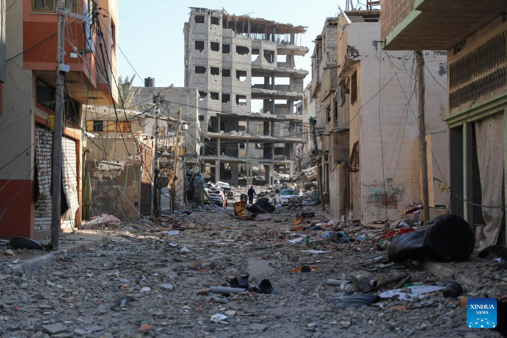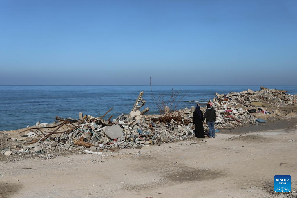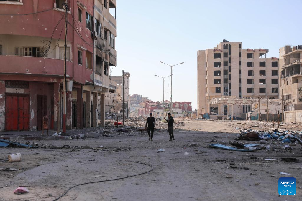 People stand in front of rubble in Gaza City, on Nov. 29, 2023. After weeks of Israeli strikes on Gaza in retaliation for an attack on Oct. 7 by Hamas against Israel, the two sides reached a four-day humanitarian truce last week, which was extended for another two days starting on Tuesday. The Palestinian death toll from the Israel-Hamas conflict has surpassed 15,000, according to Palestinian figures. Israel said that the Hamas attack killed about 1,200 people while more than 200 people were taken as hostages. (Photo by Mohammed Ali/Xinhua)