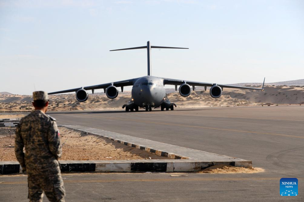 A Qatar Emiri Air Force plane carrying humanitarian aid to Gaza Strip lands in Al-Arish Airport in North Sinai Province, Egypt, Nov. 30, 2023. Egypt's State Information Service (SIS) Chairman Diaa Rashwan said on Wednesday that 239 planes carrying humanitarian aid to the war-torn Gaza Strip had landed in Egypt's Al-Arish Airport since Oct. 21. (Xinhua/Sui Xiankai)