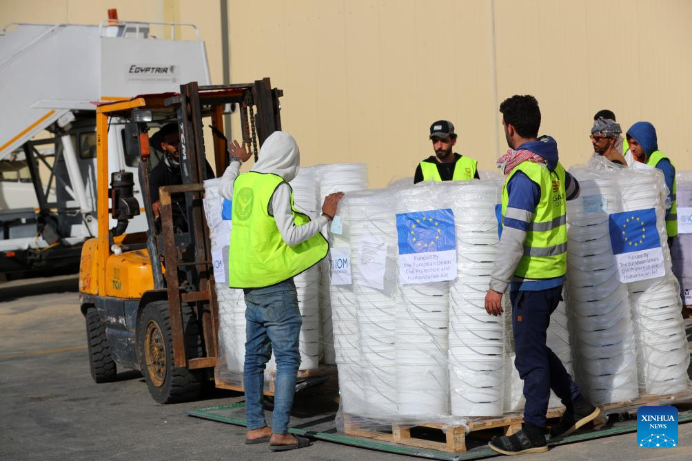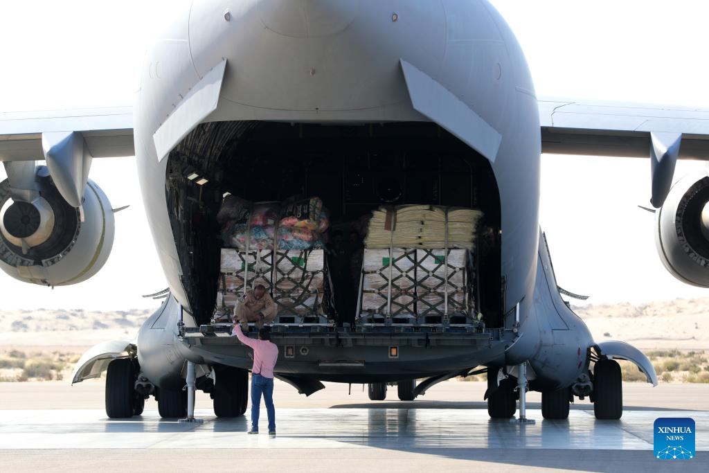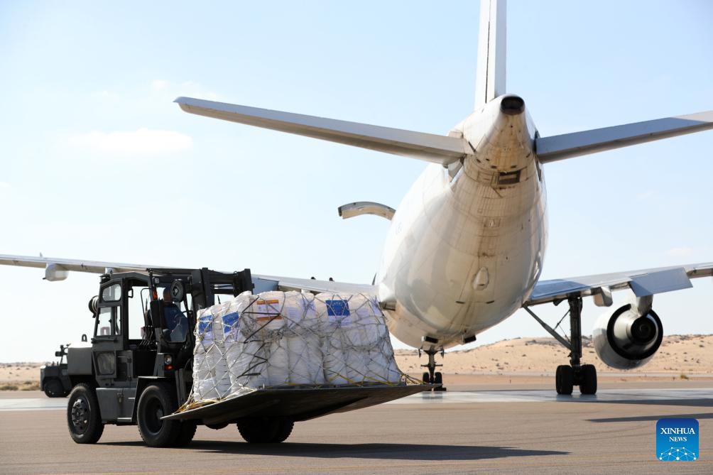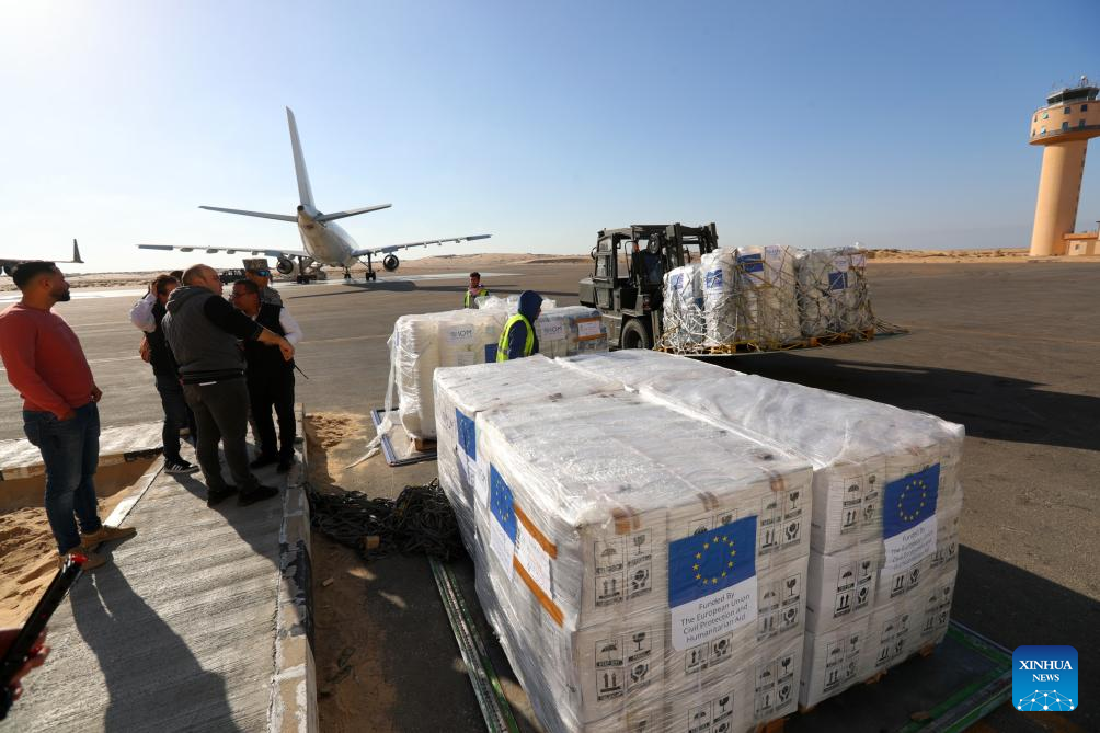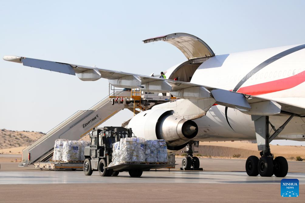 Staff members unload humanitarian aid to Gaza Strip from a plane at Al-Arish Airport in North Sinai Province, Egypt, Nov. 30, 2023. Egypt's State Information Service (SIS) Chairman Diaa Rashwan said on Wednesday that 239 planes carrying humanitarian aid to the war-torn Gaza Strip had landed in Egypt's Al-Arish Airport since Oct. 21. (Xinhua/Sui Xiankai)