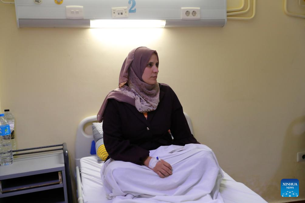 An injured Gazan woman receives treatment at El Arish General Hospital in North Sinai province, Egypt, Nov. 30, 2023. Egypt's State Information Service (SIS) Chairman Diaa Rashwan said on Wednesday that so far 575 injured Gazans had been admitted to Egyptian hospitals for treatment after the outbreak of the Israel-Hamas conflict in early October. (Xinhua/Sui Xiankai)