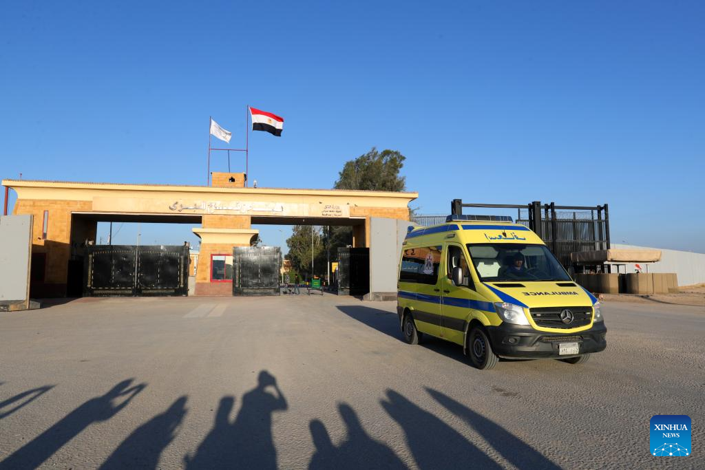 An ambulance drives through the Rafah crossing back to Egypt from Gaza on Nov. 30, 2023. Egypt's State Information Service (SIS) Chairman Diaa Rashwan said on Wednesday that so far 575 injured Gazans had been admitted to Egyptian hospitals for treatment after the outbreak of the Israel-Hamas conflict in early October. (Xinhua/Sui Xiankai)