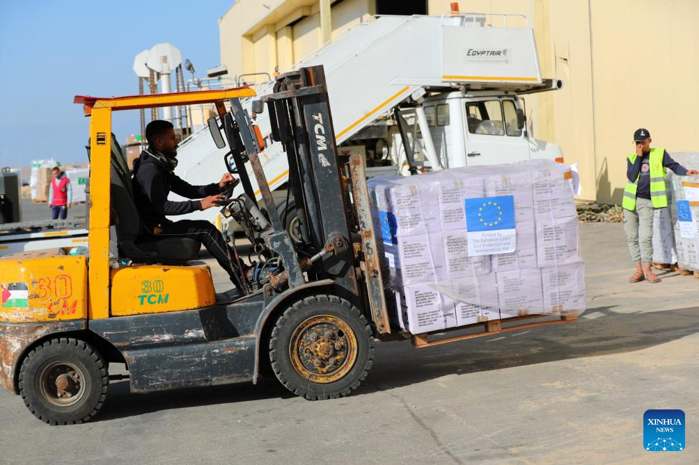 Workers transfer humanitarian aid to Gaza Strip at Al-Arish Airport in North Sinai Province, Egypt, Nov. 30, 2023. Egypt's State Information Service (SIS) Chairman Diaa Rashwan said on Wednesday that 239 planes carrying humanitarian aid to the war-torn Gaza Strip had landed in Egypt's Al-Arish Airport since Oct. 21. (Xinhua/Sui Xiankai)