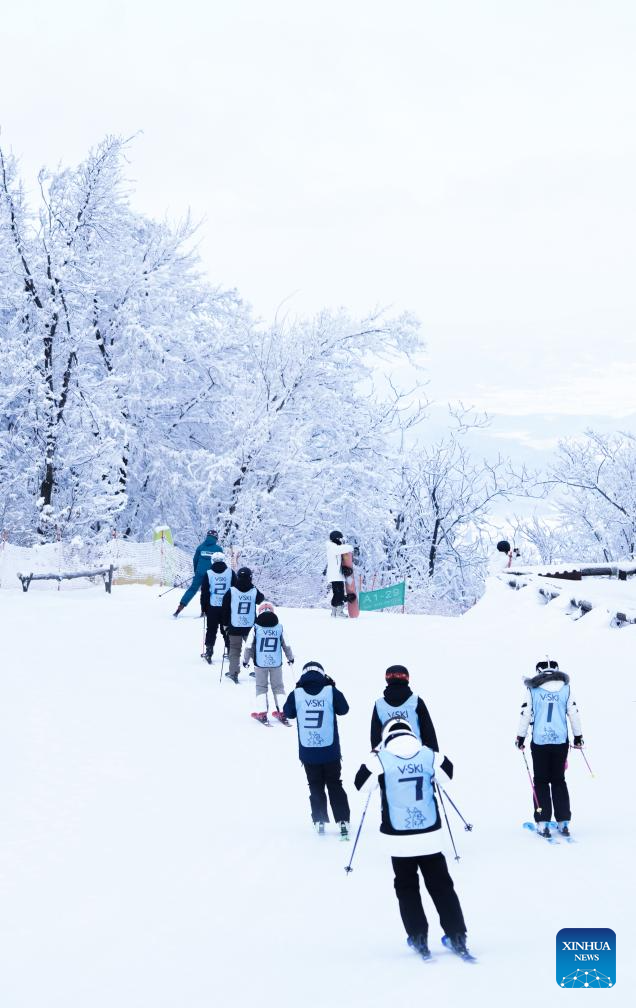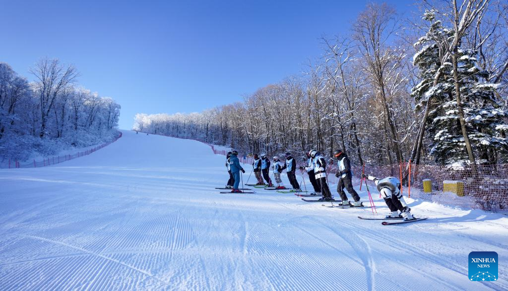 This aerial photo taken on Nov. 29, 2023, shows skiers practicing at Lake Songhua Resort in Jilin City, northeast China's Jilin Province. Yolinde Magill is a professional ski instructor from Cardrona, New Zealand. She was attracted by the advanced ski facilities and hospitality of local people during her first visit to China in 2016. Ever since then, she has come to China to provide ski training every winter.