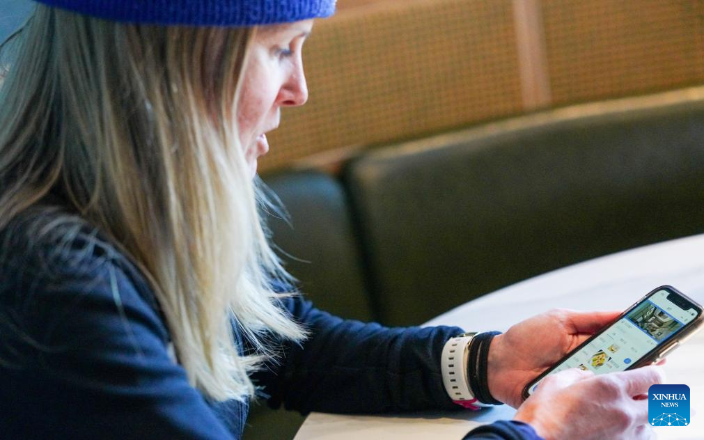Yolinde Magill orders food on her mobile phone in Jilin City, northeast China's Jilin Province, Nov. 30, 2023. Yolinde Magill is a professional ski instructor from Cardrona, New Zealand. She was attracted by the advanced ski facilities and hospitality of local people during her first visit to China in 2016. Ever since then, she has come to China to provide ski training every winter.