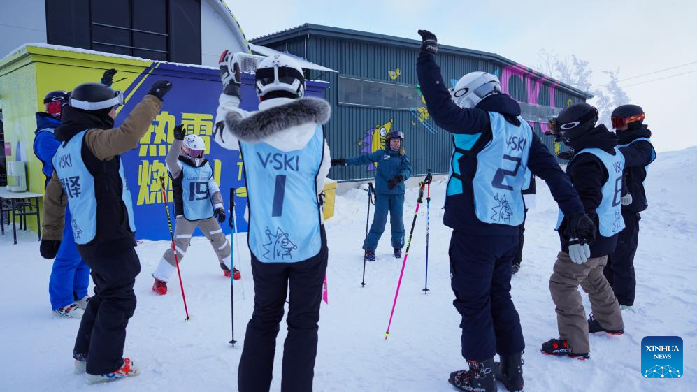 Yolinde Magill (C) warms up with Chinese skiers at Lake Songhua Resort in Jilin City, northeast China's Jilin Province, Nov. 29, 2023. Yolinde Magill is a professional ski instructor from Cardrona, New Zealand. She was attracted by the advanced ski facilities and hospitality of local people during her first visit to China in 2016. Ever since then, she has come to China to provide ski training every winter.