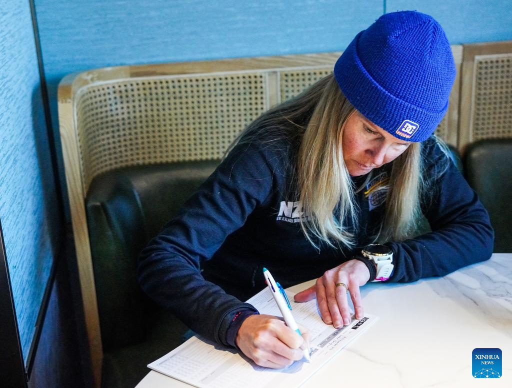 Yolinde Magill fills in the evaluation forms for Chinese skiers in Jilin City, northeast China's Jilin Province, Nov. 30, 2023. Yolinde Magill is a professional ski instructor from Cardrona, New Zealand. She was attracted by the advanced ski facilities and hospitality of local people during her first visit to China in 2016. Ever since then, she has come to China to provide ski training every winter.