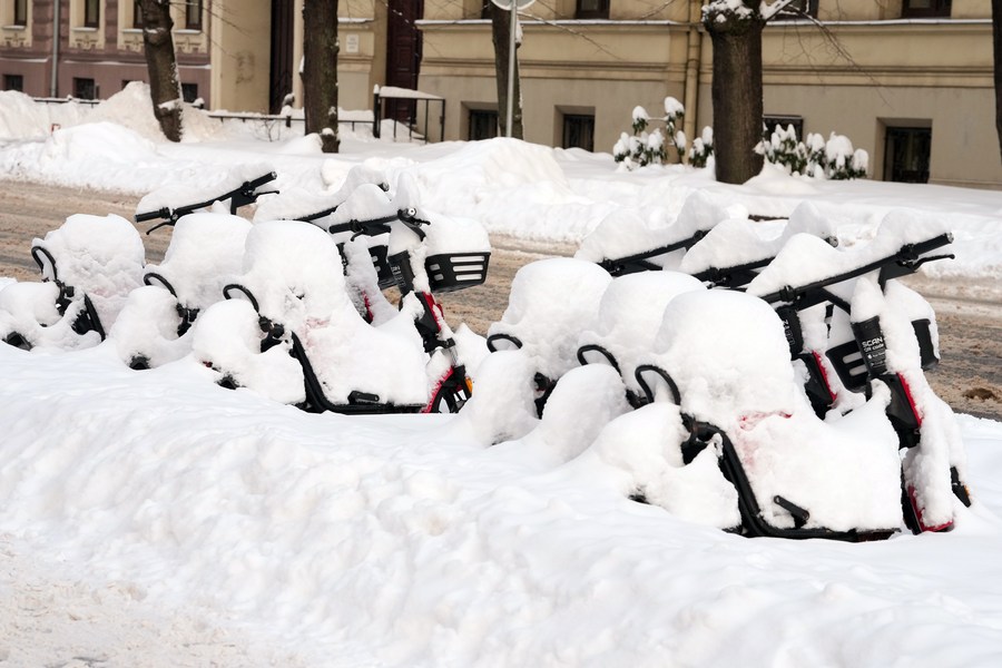 Bicycles covered with snow are pictured in Riga, Latvia, Nov. 30, 2023. (Photo by Edijs Palens/Xinhua)