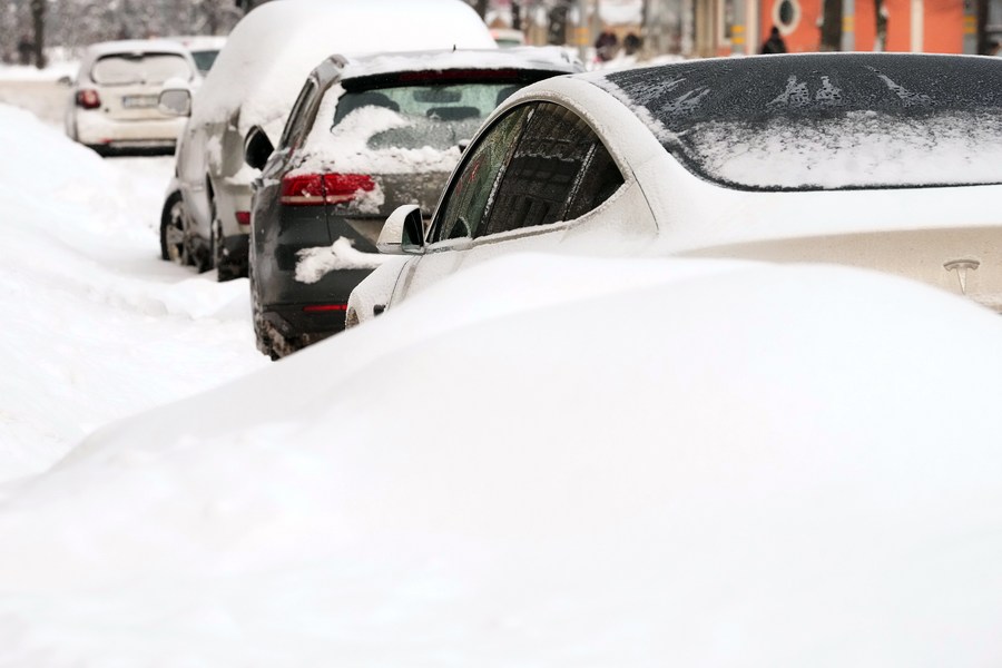 Cars covered with snow are pictured in Riga, Latvia, Nov. 30, 2023. (Photo by Edijs Palens/Xinhua)