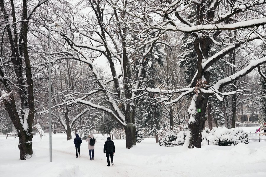 People walk in the snow in Riga, Latvia, Nov. 30, 2023. (Photo by Edijs Palens/Xinhua)■