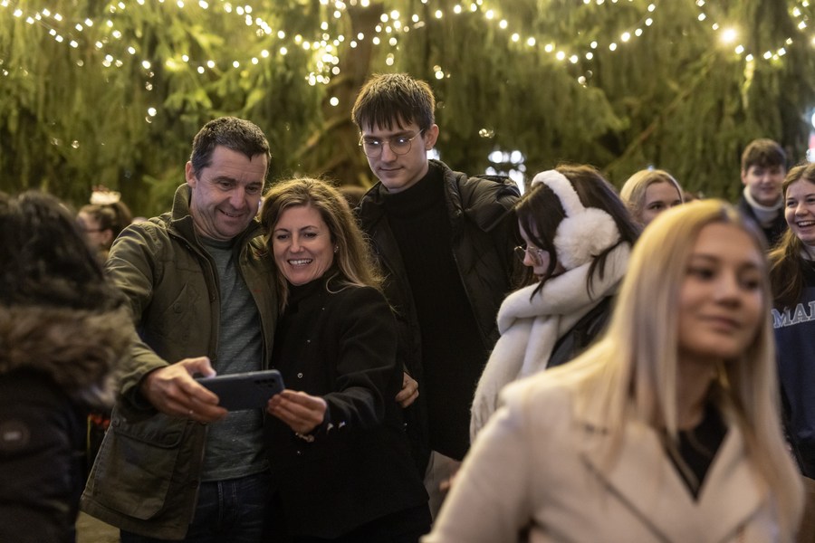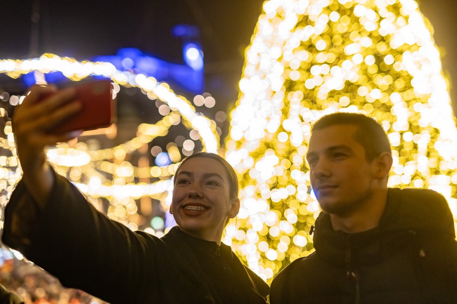 People take a selfie in front of the New Year's lights in Ljubljana, Slovenia, on Dec. 1, 2023. (Photo by Zeljko Stevanic/Xinhua)