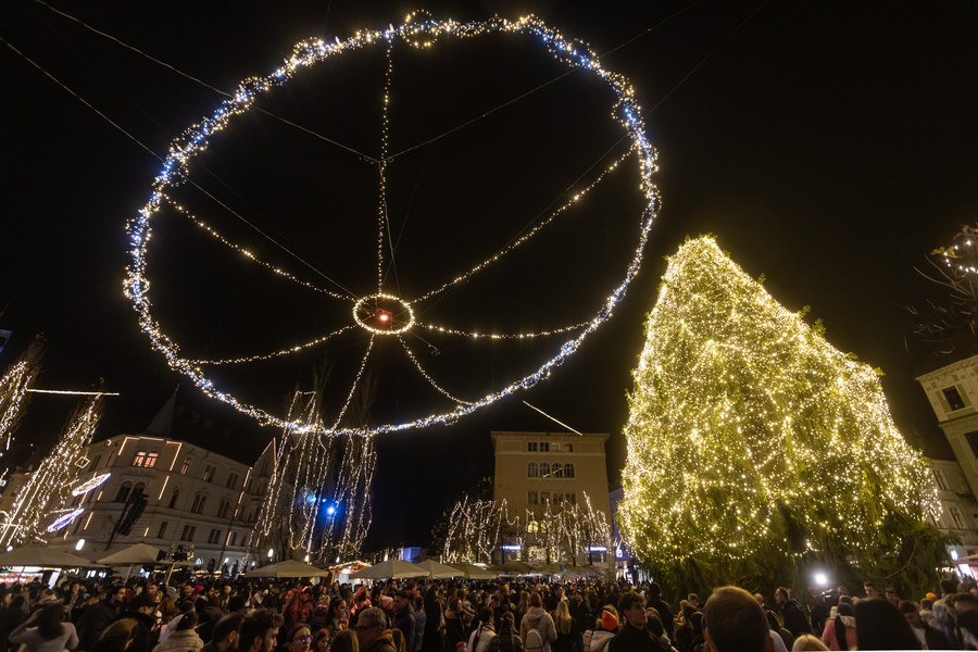 People attend a ceremonial lighting of the New Year's lights in Ljubljana, Slovenia, on Dec. 1, 2023. (Photo by Zeljko Stevanic/Xinhua)