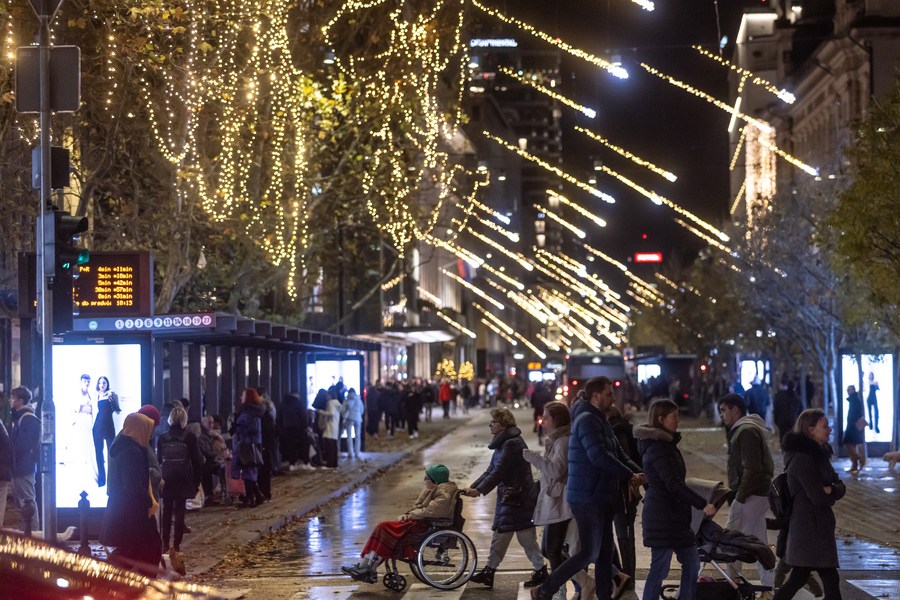 People cross a street decorated with the New Year's lights in Ljubljana, Slovenia, on Dec. 1, 2023. (Photo by Zeljko Stevanic/Xinhua)