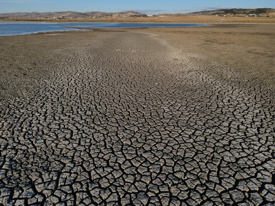 This aerial photo taken on Jan. 17, 2023 shows the cracked lake bottom of Selkapani Dam Lake in Ankara, Türkiye. (Photo by Mustafa Kaya/Xinhua)