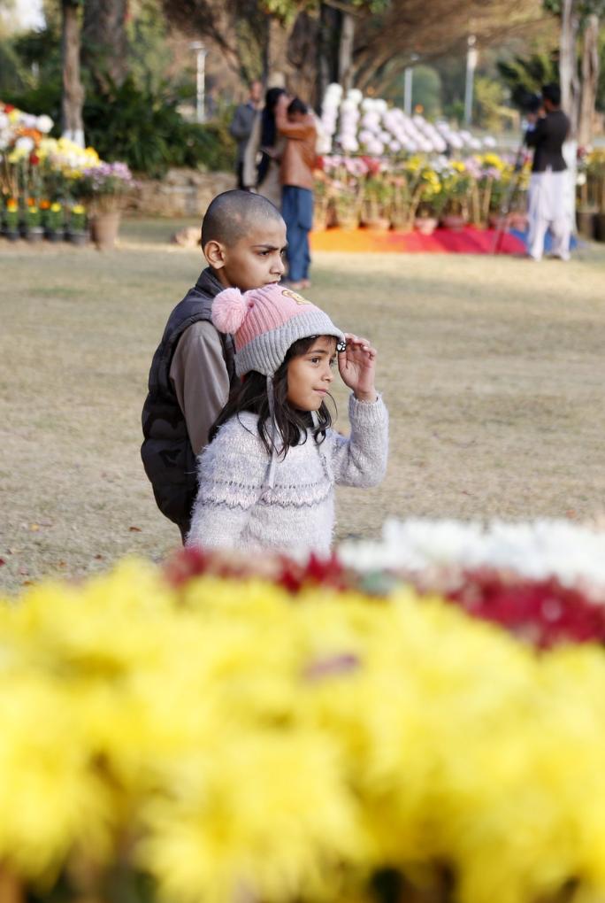 Children visit a flower show in Islamabad, Pakistan, on Dec. 1, 2023. (Xinhua/Ahmad Kamal)