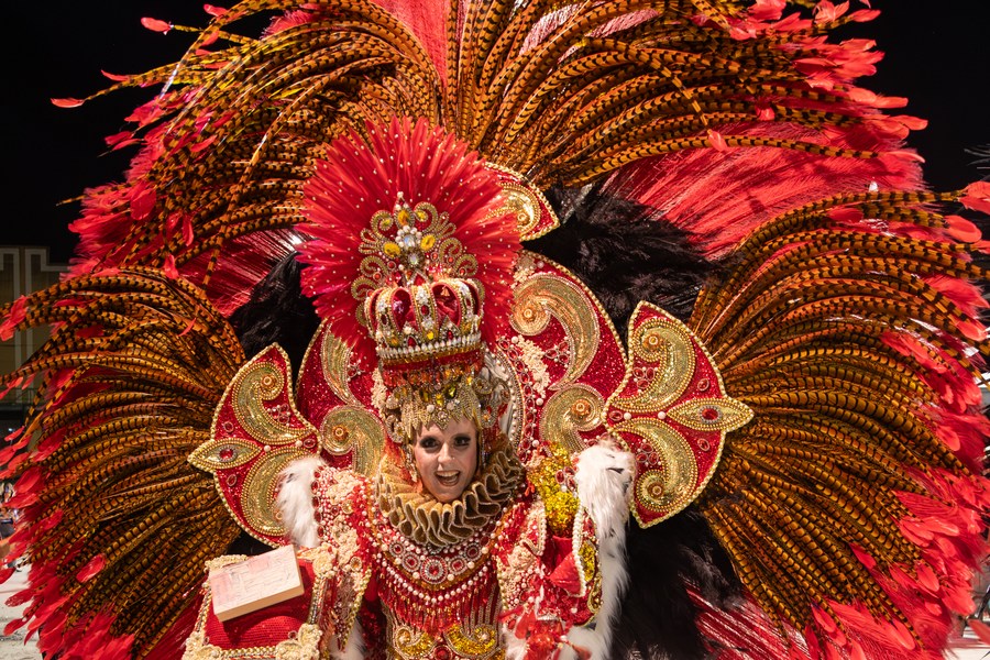 A performer from Salgueiro samba school participates in the samba parade at Cidade do Samba in Rio de Janeiro, Brazil, Dec. 2, 2023. A two-day event was held here to celebrate Brazil's National Samba Day which falls on Dec. 2. (Xinhua/Wang Tiancong)■
