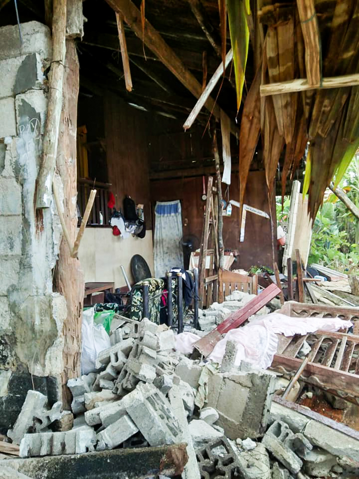 A damaged house is seen after an earthquake struck Surigao del Sur province, the Philippines on Dec. 3, 2023. A 7.4-magnitude offshore earthquake that hit southern Philippines late Saturday night has killed at least one and injured two others, local authorities reported Sunday. (Xinhua)
