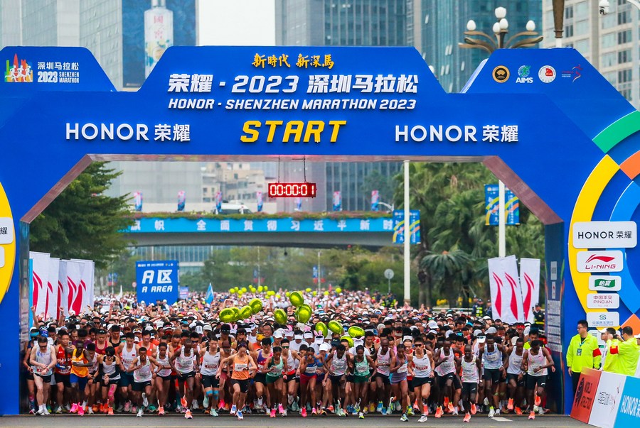 Participants take part in the Shenzhen Marathon 2023 in Shenzhen, south China's Guangdong Province, Dec. 3, 2023. (Photo by Peng Zhigang/Xinhua)
