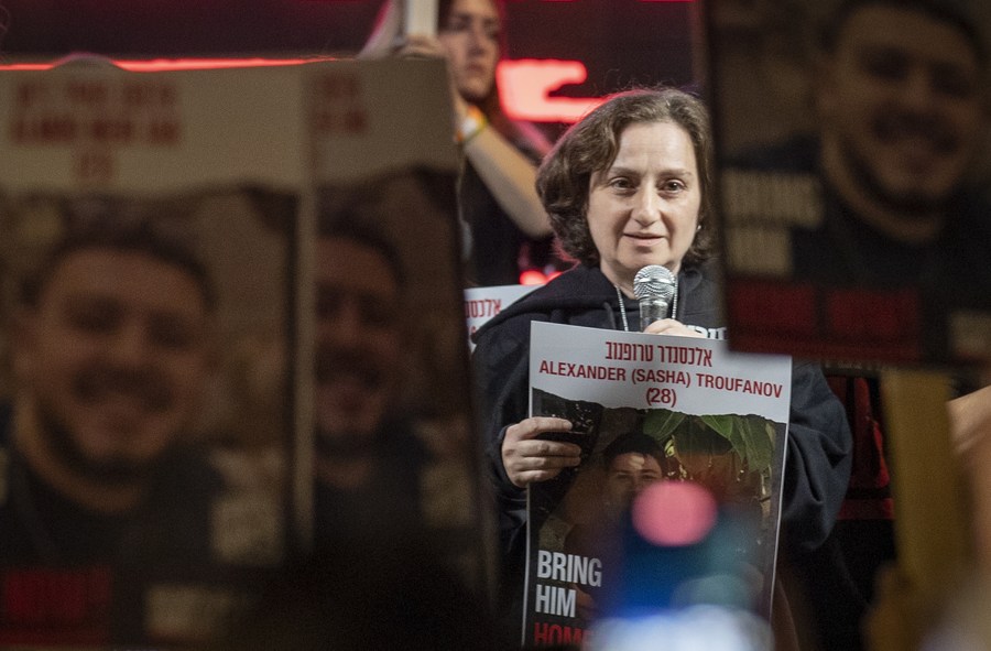 A woman who was once a hostage in the Gaza Strip takes part in a rally for the release of the remaining hostages, in Tel Aviv, Israel, Dec. 2, 2023. Israeli Prime Minister Benjamin Netanyahu said on Saturday that freeing hostages in Gaza would be "impossible" without continuing Israel's deadly ground operation, after pulling his team from talks in Qatar on a ceasefire with Hamas. (Xinhua/Chen Junqing)