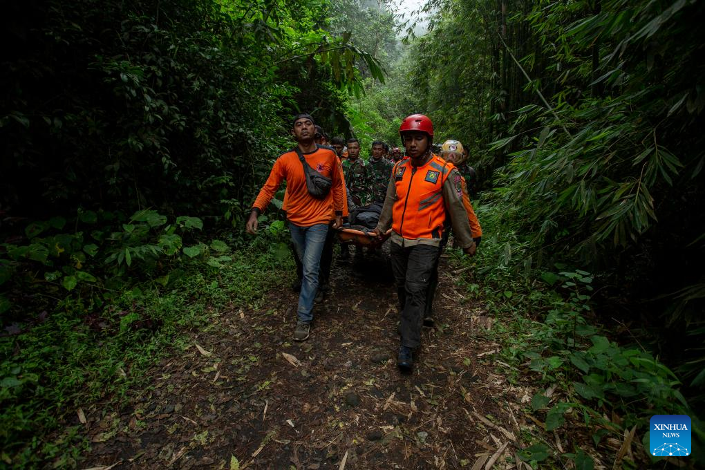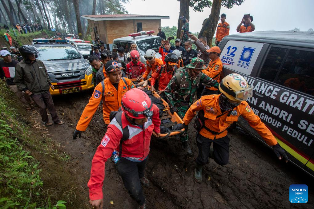 Rescuers transfer the injured near Marapi volcano in West Sumatra, Indonesia, Dec. 4, 2023. At least 11 mountain climbers died and some others were still missing after the eruption of Marapi volcano on Indonesia's Sumatra Island, a local rescue official said on Monday. (Photo by Andri Mardiansyah/Xinhua)